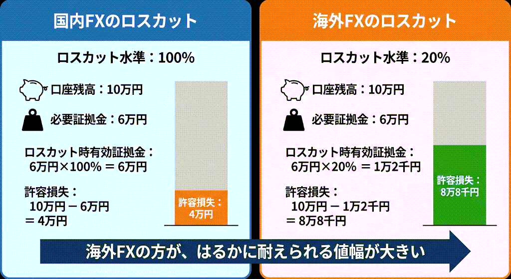 海外FXでは、ロスカット水準が20%〜30%に設定されていることが多く、国内FXよりも余裕があります。